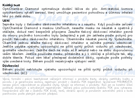 OptiChamber Diamond optimalizuje dodání léčiva do plic. Anti-statická komora optichamberu vytváří aerosol, který umožňuje pacientovi pohodlnou a účinnou inhalaci léku po delší dobu.