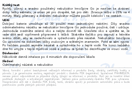 Rychlý, účinný a snadno použitelný nebulizátor InnoSpire Go je navržen ke zkrácení doby léčby astmatu, je určen jak pro dospělé, tak pro děti. Zkracuje léčbu o 25% na 4 minuty. Malý, přenosný a diskrétní nebulizátor můžete použít kdekoliv i na cestách.
