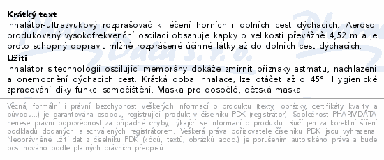 Inhalátor-ultrazvukový rozprašovač k léčení horních i dolních cest dýchacích. Aerosol produkovaný vysokofrekvenční oscilací obsahuje kapky o velikosti převážně 4,52 m a je proto schopný dopravit mlžně rozprášené účinné látky až do dolních cest dýchacích.