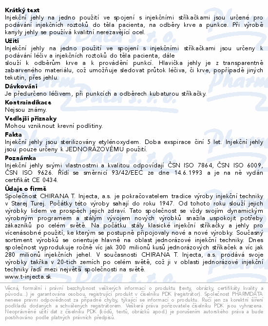 Injekční jehly na jedno použití ve spojení s injekčními stříkačkami jsou určené pro podávání injekčních roztoků do těla pacienta, na odběry krve a punkce. Při výrobě kanyly jehly se používá kvalitní nerezavějící ocel.