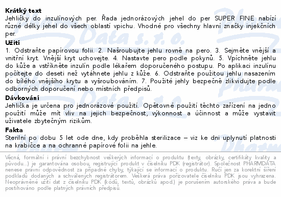 Jehličky do inzulínových per. Řada jednorázových jehel do per SUPER FINE nabízí různé délky jehel do všech oblastí vpichu. Vhodné pro všechny hlavní značky injekčních per.