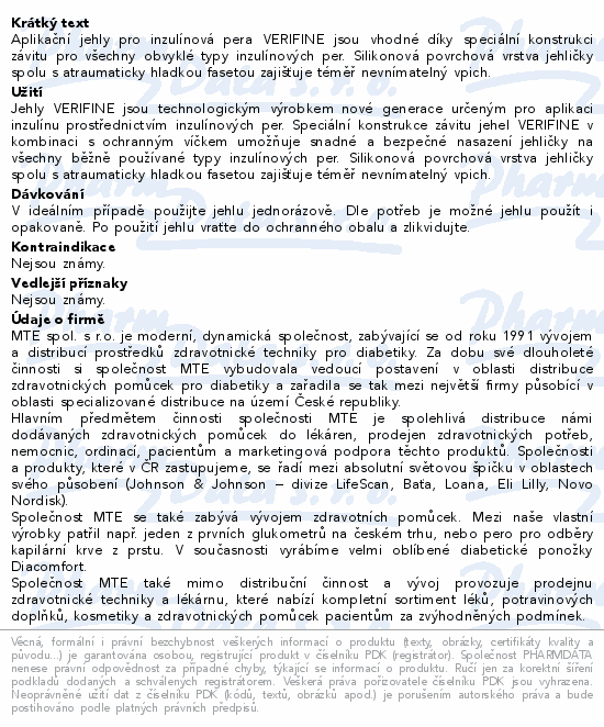 Aplikační jehly pro inzulínová pera VERIFINE jsou vhodné díky speciální konstrukci závitu pro všechny obvyklé typy inzulínových per. Silikonová povrchová vrstva jehličky spolu s atraumaticky hladkou fasetou zajišťuje téměř nevnímatelný vpich.