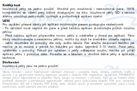 Inzulinové jehly na jedno použití. Vhodné pro inzulinová i neinzulinová pera. 100% kompatibilní se všemi pery běžně dostupnými na trhu. Inzulinové jehly BD s tenkou stěnou umožňují jednodušší, rychlejší a pohodlnější aplikaci injekcí.
