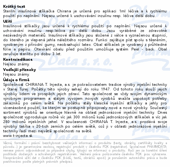 Sterilní insulínová stříkačka Chirana je určená pro aplikaci 1ml léčiva a k rychlému použití po naplnění. Nejsou určené k uschovávání inzulínu resp. léčiva delší dobu.