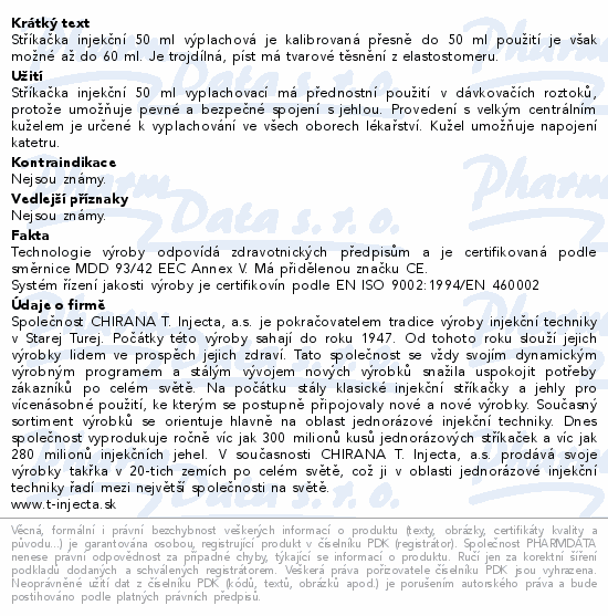 Stříkačka injekční 50 ml výplachová je kalibrovaná přesně do 50 ml použití je však možné až do 60 ml. Je trojdílná, píst má tvarové těsnění z elastostomeru.