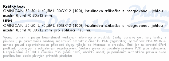 OMNICAN 50-50I.U./0,5ML 30GX12 (100), Inzulinová stříkačka s integrovanou jehlou - inzulin 0,5ml /0,30x12 mm.