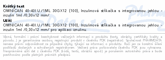 OMNICAN 40-40I.U./1ML 30GX12 (100), Inzulinová stříkačka s integrovanou jehlou - inzulin 1ml /0,30x12 mm/.