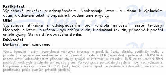 Výplachová stříkačka s odstupňováním. Neobsahuje latex. Je určena k výplachům dutin, k odsávání tekutin, případně k podání umělé výživy.
