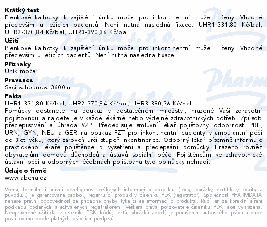Plenkové kalhotky k zajištění úniku moče pro inkontinentní muže i ženy. Vhodné především u ležících pacientů. Není nutná následná fixace. UHR1-331,80 Kč/bal, UHR2-370,84 Kč/bal, UHR3-390,36 Kč/bal.