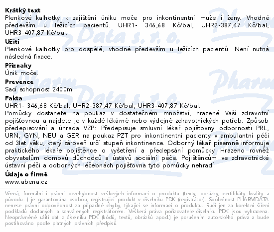 Plenkové kalhotky k zajištění úniku moče pro inkontinentní muže i ženy. Vhodné především u ležících pacientů. UHR1- 346,68 Kč/bal, UHR2-387,47 Kč/bal, UHR3-407,87 Kč/bal.