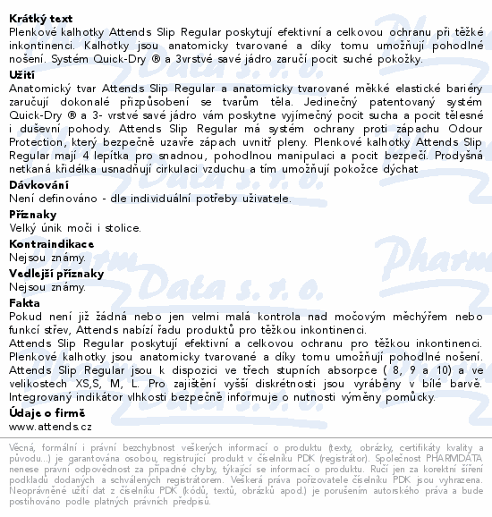 Plenkové kalhotky Attends Slip Regular poskytují efektivní a celkovou ochranu při těžké inkontinenci. Kalhotky jsou anatomicky tvarované a díky tomu umožňují pohodlné nošení. Systém Quick-Dry ® a 3vrstvé savé jádro zaručí pocit suché pokožky.