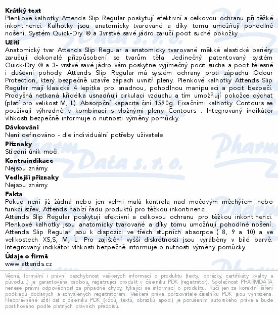 Plenkové kalhotky Attends Slip Regular poskytují efektivní a celkovou ochranu při těžké inkontinenci. Kalhotky jsou anatomicky tvarované a díky tomu umožňují pohodlné nošení. Systém Quick-Dry ® a 3vrstvé savé jádro zaručí pocit suché pokožky .