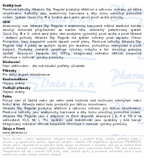 Plenkové kalhotky Attends Slip Regular poskytují efektivní a celkovou ochranu při těžké inkontinenci. Kalhotky jsou anatomicky tvarované a díky tomu umožňují pohodlné nošení. Systém Quick-Dry ® a 3vrstvé savé jádro zaručí pocit suché pokožky.