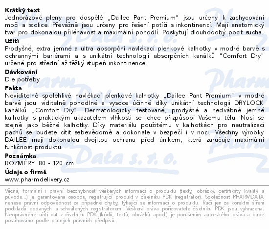 Jednorázové pleny pro dospělé „Dailee Pant Premium“ jsou určeny k zachycování moči a stolice. Převážně jsou určeny pro řešení potíží s inkontinencí. Mají anatomický tvar pro dokonalou přiléhavost a maximální pohodlí. Poskytují dlouhodobý pocit sucha.