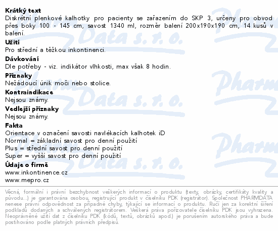 Diskrétní plenkové kalhotky pro pacienty se zařazením do SKP 3, určeny pro obvod přes boky 100 - 145 cm, savost 1340 ml, rozměr balení 200x190x190 cm, 14 kusů v balení.