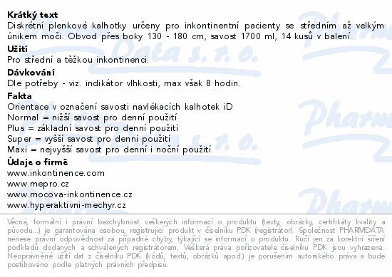 Diskrétní plenkové kalhotky určeny pro inkontinentní pacienty se středním až velkým únikem moči. Obvod přes boky 130 - 180 cm, savost 1700 ml, 14 kusů v balení.