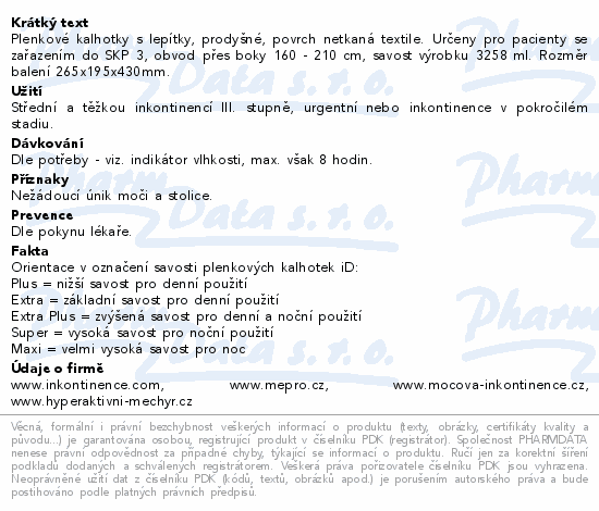 Plenkové kalhotky s lepítky, prodyšné, povrch netkaná textile. Určeny pro pacienty se zařazením do SKP 3, obvod přes boky 160 - 210 cm, savost výrobku 3258 ml. Rozměr balení 265x195x430mm.