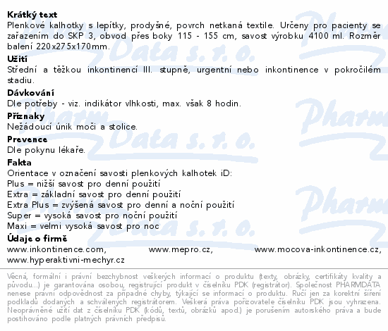 Plenkové kalhotky s lepítky, prodyšné, povrch netkaná textile. Určeny pro pacienty se zařazením do SKP 3, obvod přes boky 115 - 155 cm, savost výrobku 4100 ml. Rozměr balení 220x275x170mm.