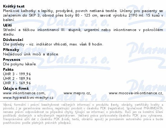 Plenkové kalhotky s lepítky, prodyšné, povrch netkaná textile. Určeny pro pacienty se zařazením do SKP 3, obvod přes boky 80 - 125 cm, savost výrobku 2190 ml. 15 kusů v balení.