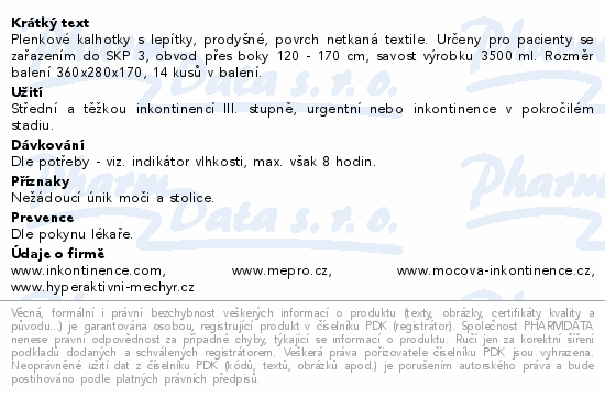 Plenkové kalhotky s lepítky, prodyšné, povrch netkaná textile. Určeny pro pacienty se zařazením do SKP 3, obvod přes boky 120 - 170 cm, savost výrobku 3500 ml. Rozměr balení 360x280x170, 14 kusů v balení.