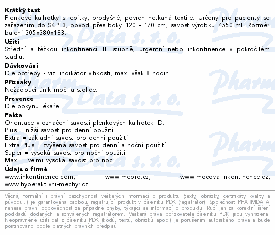 Plenkové kalhotky s lepítky, prodyšné, povrch netkaná textile. Určeny pro pacienty se zařazením do SKP 3, obvod přes boky 120 - 170 cm, savost výrobku 4550 ml. Rozměr balení 305x380x183.