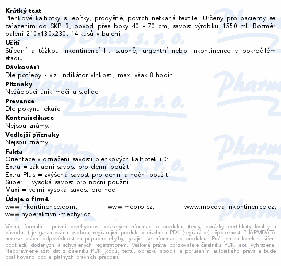 Plenkové kalhotky s lepítky, prodyšné, povrch netkaná textile. Určeny pro pacienty se zařazením do SKP 3, obvod přes boky 40 - 70 cm, savost výrobku 1550 ml. Rozměr balení 210x130x230, 14 kusů v balení.