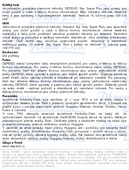 Inkontinenční prodyšné plenkové kalhotky DEPEND Slip Super Plus jsou určeny pro noční použití u osob s těžkou formou inkontinence. Mají indikátor vlhkosti, elastické lemy a jsou vyrobeny z hypoalergenních materiálů. Velikost XL (obvod pasu 150-170 cm).