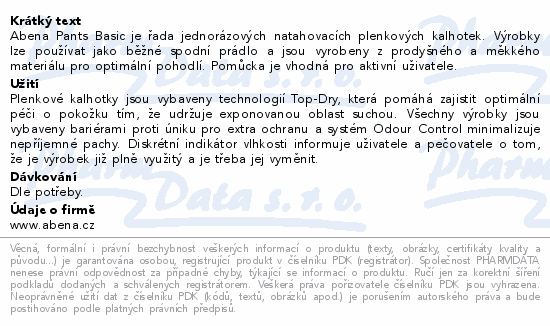 Abena Pants Basic je řada jednorázových natahovacích plenkových kalhotek. Výrobky lze používat jako běžné spodní prádlo a jsou vyrobeny z prodyšného a měkkého materiálu pro optimální pohodlí. Pomůcka je vhodná pro aktivní uživatele.