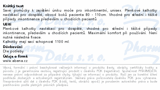 Savé pomůcky k zajištění úniku moče pro inkontinentní, unisex. Plenkové kalhotky navlékací pro dospělé, obvod boků pacienta 80 - 110cm. Vhodné pro střední i těžké případy inkontinence především u chodících pacientů.