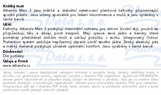 Attends Men 3 jsou měkké a diskrétní natahovací plenkové kalhotky připomínající spodní prádlo. Jsou určeny speciálně pro řešení lnkontinence u mužů a jsou vyráběny v černé barvě.