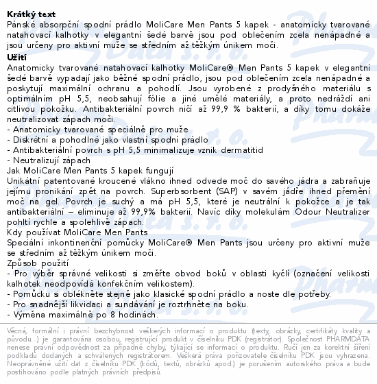 Pánské absorpční spodní prádlo MoliCare Men Pants 5 kapek - anatomicky tvarované natahovací kalhotky v elegantní šedé barvě jsou pod oblečením zcela nenápadné a jsou určeny pro aktivní muže se středním až těžkým únikem moči.