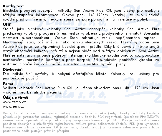 Elastické prodyšné absorpční kalhotky Seni Active Plus XXL jsou určeny pro osoby s těžkým stupněm inkontinence. Obvod pasu 140-190cm. Natahují se jako klasické spodní prádlo. Příjemný, měkký materiál zajišťuje pohodlí a ničím nerušený pohyb.