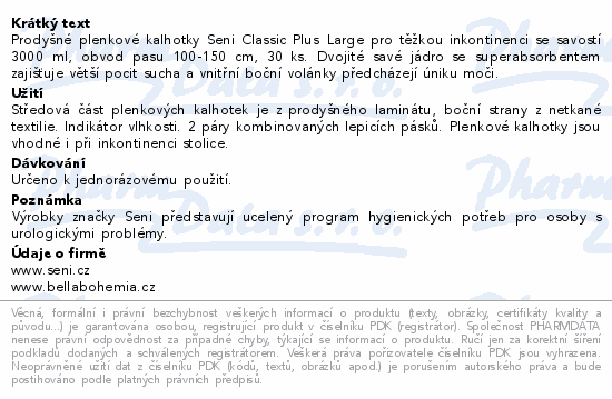 Prodyšné plenkové kalhotky Seni Classic Plus Large pro těžkou inkontinenci se savostí 3000 ml, obvod pasu 100-150 cm, 30 ks. Dvojité savé jádro se superabsorbentem zajišťuje větší pocit sucha a vnitřní boční volánky předcházejí úniku moči.