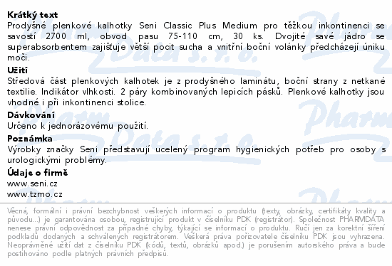 Prodyšné plenkové kalhotky Seni Classic Plus Medium pro těžkou inkontinenci se savostí 2700 ml, obvod pasu 75-110 cm, 30 ks. Dvojité savé jádro se superabsorbentem zajišťuje větší pocit sucha a vnitřní boční volánky předcházejí úniku moči.