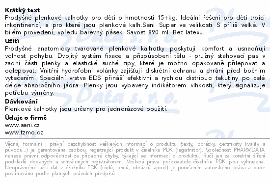 Prodyšné plenkové kalhotky pro děti o hmotnosti 15+kg. Ideální řešení pro děti trpící inkontinencí, a pro které jsou plenkové kalh.Seni Super ve velikosti S příliš velké. V bílém provedení, vpředu barevný pásek. Savost 890 ml. Bez latexu.