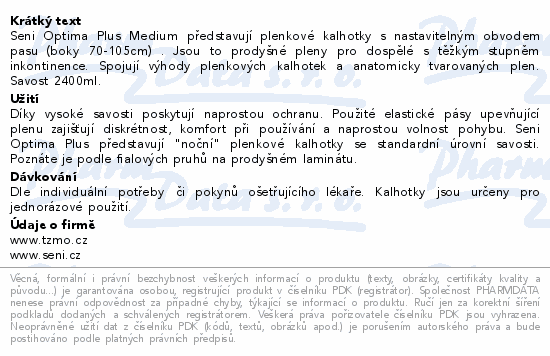 Seni Optima Plus Medium představují plenkové kalhotky s nastavitelným obvodem pasu (boky 70-105cm) . Jsou to prodyšné pleny pro dospělé s těžkým stupněm inkontinence. Spojují výhody plenkových kalhotek a anatomicky tvarovaných plen. Savost 2400ml.