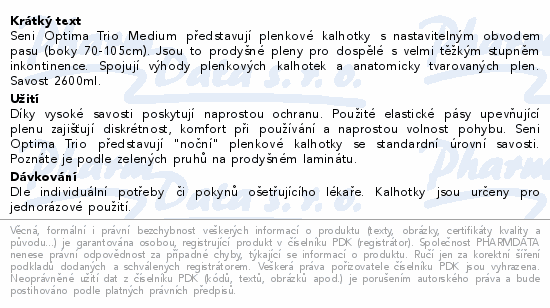 Seni Optima Trio Medium představují plenkové kalhotky s nastavitelným obvodem pasu (boky 70-105cm). Jsou to prodyšné pleny pro dospělé s velmi těžkým stupněm inkontinence. Spojují výhody plenkových kalhotek a anatomicky tvarovaných plen. Savost 2600ml.