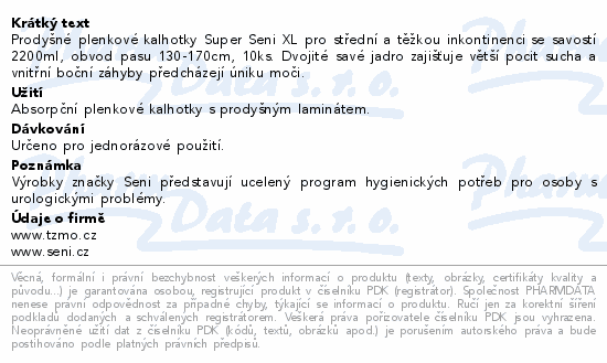 Prodyšné plenkové kalhotky Super Seni XL pro střední a těžkou inkontinenci se savostí 2200ml, obvod pasu 130-170cm, 10ks. Dvojité savé jadro zajišťuje větší pocit sucha a vnitřní boční záhyby předcházejí úniku moči.