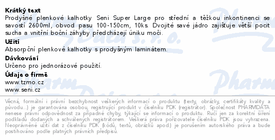 Prodyšné plenkové kalhotky Seni Super Large pro střední a těžkou inkontinenci se savostí 2600ml, obvod pasu 100-150cm, 10ks. Dvojité savé jádro zajišťuje větší pocit sucha a vnitřní boční záhyby předcházejí úniku moči.