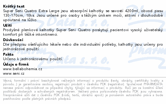 Super Seni Quatro Extra Large jsou absorpční kalhotky se savostí 4200ml, obvod pasu 130-170cm, 10ks. Jsou určené pro osoby s těžkým únikem moči, aktivní i dlouhodobě upoutané na lůžko.