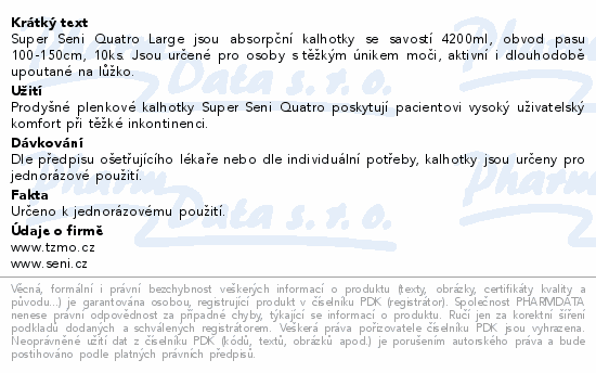 Super Seni Quatro Large jsou absorpční kalhotky se savostí 4200ml, obvod pasu 100-150cm, 10ks. Jsou určené pro osoby s těžkým únikem moči, aktivní i dlouhodobě upoutané na lůžko.