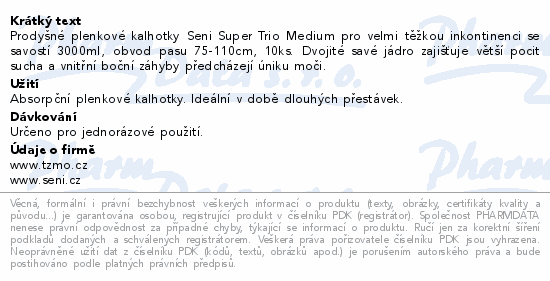Prodyšné plenkové kalhotky Seni Super Trio Medium pro velmi těžkou inkontinenci se savostí 3000ml, obvod pasu 75-110cm, 10ks. Dvojité savé jádro zajišťuje větší pocit sucha a vnitřní boční záhyby předcházejí úniku moči.