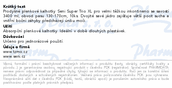 Prodyšné plenkové kalhotky Seni Super Trio XL pro velmi těžkou inkontinenci se savostí 3400 ml, obvod pasu 130-170cm, 10ks. Dvojité savé jádro zajišťuje větší pocit sucha a vnitřní boční záhyby předcházejí úniku moči.