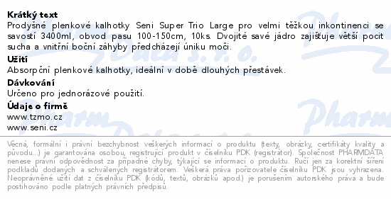Prodyšné plenkové kalhotky Seni Super Trio Large pro velmi těžkou inkontinenci se savostí 3400ml, obvod pasu 100-150cm, 10ks. Dvojité savé jádro zajišťuje větší pocit sucha a vnitřní boční záhyby předcházejí úniku moči.
