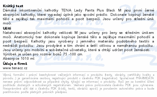 Dámské inkontinenční kalhotky TENA Lady Pants Plus Black M jsou první černé absorpční kalhotky, které vypadají úplně jako spodní prádlo. Dokonale kopírují ženské tělo a zajišťují tak maximální pohodlí a pocit bezpečí. Jsou určeny pro střední únik moči.