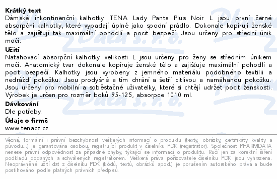 Dámské inkontinenční kalhotky TENA Lady Pants Plus Noir L jsou první černé absorpční kalhotky, které vypadají úplně jako spodní prádlo. Dokonale kopírují ženské tělo a zajišťují tak maximální pohodlí a pocit bezpečí. Jsou určeny pro střední únik moči.