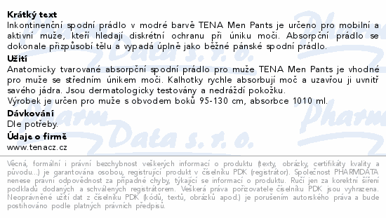 Pánské inkontinenční spodní prádlo v modré barvě TENA Men Pants je určeno pro mobilní a aktivní muže, kteří hledají diskrétní ochranu při úniku moči. Absorpční prádlo se dokonale přizpůsobí tělu a vypadá úplně jako běžné pánské spodní prádlo.