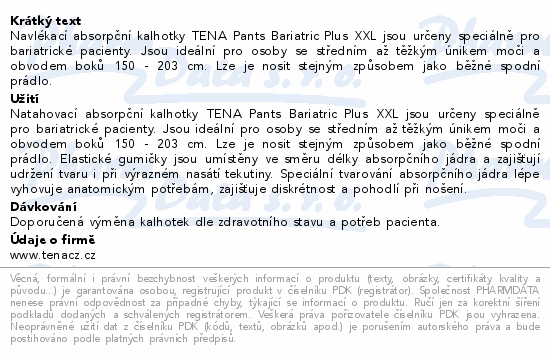 Navlékací absorpční kalhotky TENA Pants Bariatric Plus XXL jsou určeny speciálně pro bariatrické pacienty. Jsou ideální pro osoby se středním až těžkým únikem moči a obvodem boků 150 - 203 cm. Lze je nosit stejným způsobem jako běžné spodní prádlo.