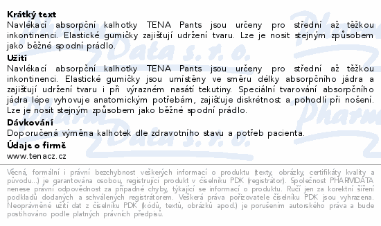 Navlékací absorpční kalhotky TENA Pants jsou určeny pro střední až těžkou inkontinenci. Elastické gumičky zajišťují udržení tvaru. Lze je nosit stejným způsobem jako běžné spodní prádlo.