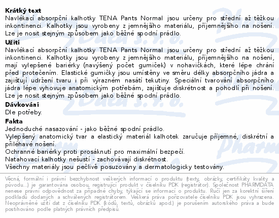 Navlékací absorpční kalhotky TENA Pants Normal jsou určeny pro střední až těžkou inkontinenci. Kalhotky jsou vyrobeny z jemnějšího materiálu, příjemnějšího na nošení. Lze je nosit stejným způsobem jako běžné spodní prádlo.
